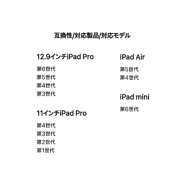 互換性: 12.9インチiPad Pro(第3世代、第4世代、第5世代、第6世代)、 11インチiPad Pro(第1世代、第2世代、第3世代、第4世代)、 iPad Air(第4世代、第5世代)、iPad mini(第6世代)