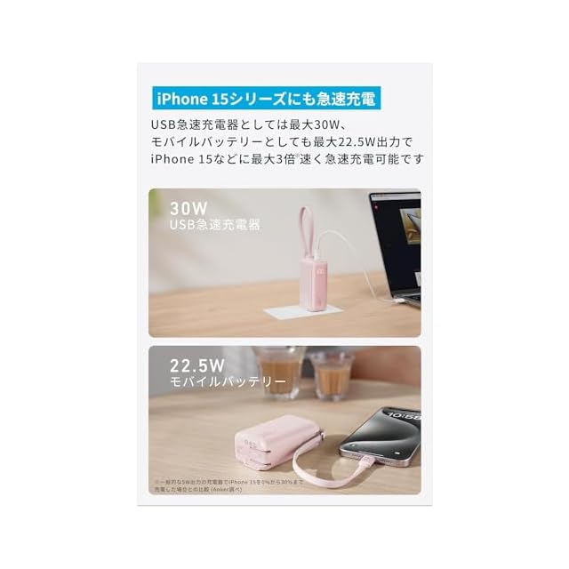 コンパクトながらパワフル:充電器としては最大30W、モバイルバッテリーとしても最大22.5W出力でiPhone 16シリーズにも最大3倍速く急速充電が可能です。また本体表面にはディスプレイを搭載し、バッテリーの残量をリアルタイムかつ一目で確認できます。※一般的な5W出力の充電器でiPhone 16を0%から50%まで充電した場合との比較(Anker調べ)
