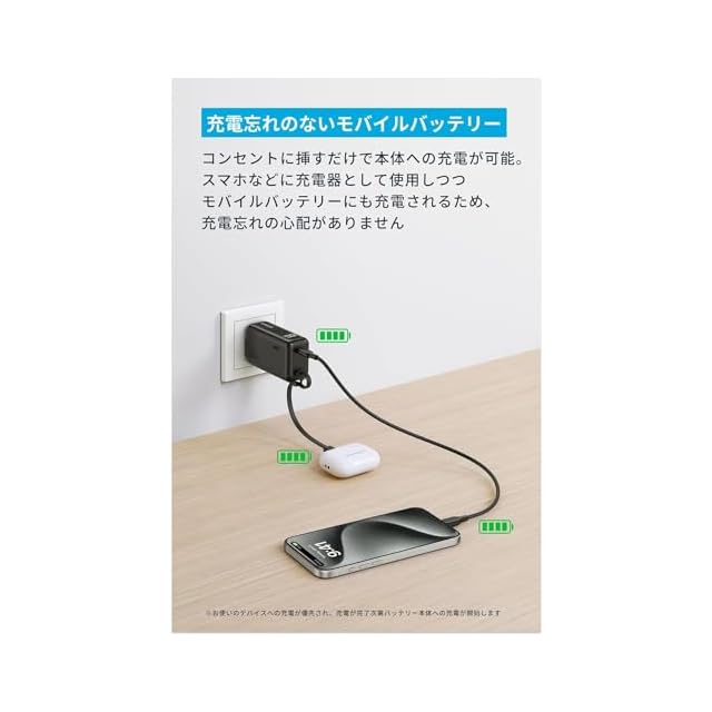 充電忘れのないモバイルバッテリー:コンセントに挿すだけで本体への充電が可能。スマホなどに充電器として使用しつつモバイルバッテリーにも充電されるため、充電忘れの心配がありません。※お使いのデバイスへの充電が優先され、充電が完了次第バッテリー本体への充電が開始します