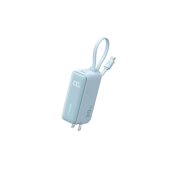 商品名:Anker Power Bank (30W, Fusion, Built-In USB-C ケーブル) (5000mAh 22.5W出力モバイルバッテリー搭載 30W出力充電器) / LEDディスプレイ搭載/USB-Cケーブル一体型/コンセント一体型/折りたたみ式プラグ 1台3役 / iPhone 16 / 15 Android iPad その他各種機器対応 (ブルー)