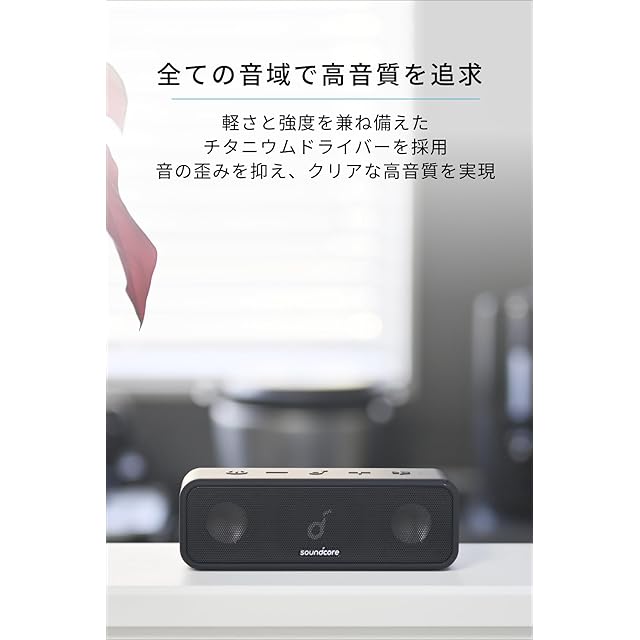 Soundcore | Hear It. Feel It.<br> 「Soundcore」は、Ankerで培ったノウハウやバッテリー技術を受け継ぎながら、最先端のオーディオテクノロジーを駆使し、こだわりの音の体験を提供するオーディオブランドです。<br><br> 主な製品仕様<br>サイズ:約174×57×59 mm <br> 重量:約500g<br> 防水規格:IPX7(※一時的(30分)に一定水深(1m)の条件に水没しても内部に浸水しないと定義されています。)<br> 通信方式:Bluetooth 5<br> オーディオ出力:16W(8W × 2) <br>再生可能時間:約24時間<br><br> パワフルなステレオサウンド<br>Soundcore 3はコンパクトサイズながら、最大16Wの豊かで鮮明なステレオサウンドを実現し、屋内の使用だけでなく、屋外での使用にも最適です。<br><br> チタニウムドライバー<br>チタニウムドライバーを搭載し、音の歪みを最小限に押さえます。<br><br> 40kHzまでの高域<br>40kHzまでの周波数帯に対応し、クリアな高音を実現。曲の細部まで忠実に再現します。<br><br> BassUpテクノロジー<br>アップグレードされたデジタルシグナルプロセッサを使用し、再生する楽曲をリアルタイムで分析し、低音をより力強く、より鮮明に響かせます。体全体に響くサウンドを体験してください。<br><br> PartyCast機能<br>100以上のSoundcore 3もしくはPartyCastスピーカーとペアリングして、深みと広がりのある大音量ステレオサウンドを簡単に実現できます。<br> <br> Soundcoreアプリ対応<br>Soundcoreアプリを使ってイコライザーをカスタマイズし、お気に入りの音楽ジャンルに最適なミックスを作成できます。<br><br>持ち運びに便利<br>Soundcoreアプリを使ってイコライザーをカスタマイズし、お気に入りの音楽ジャンルに最適なミックスを作成できます。<br><br>USB-Cポート採用<br>充電ポートにUSB-Cを採用しているため、スマートフォンやノートPCと同じケーブルをご使用いただけます。