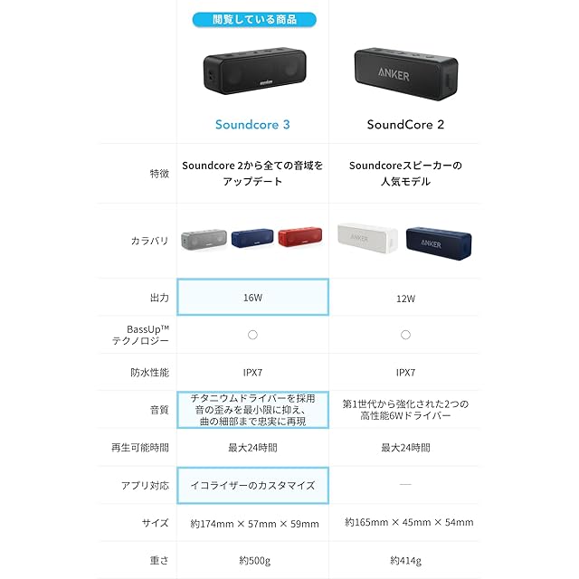 さらに進化:⼈気モデル「Anker SoundCore 2」の使いやすさはそのままに、サウンドの品質と機能性をアップグレード。ドライバーの出⼒を12W→16Wに強化すると共に、低⾳から⾼⾳まで全ての⾳域で⾼⾳質を追求しました。またSoundcoreアプリ対応やUSB-Cポートの採⽤等、機能⾯も拡充しました。