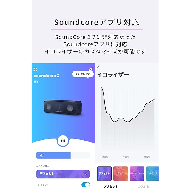 Soundcoreアプリ対応:Soundcoreアプリを使⽤すると、イコライザーをプリセットの4種類から選択またはお好みに合わせてカスタマイズできます。また、アプリからはBassUpのOn / Off 切り替えが可能です。