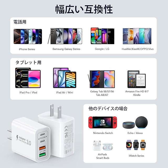 ⚡【ユニバーサル互換性PD充電器】: タイプc アダプタは特別な 4 ポートのため、ほぼすべての電子機器と互換性があります。iPhone 16/15/15 Pro /15 Pro Max/14/14 Pro/14 Pro Max/13/13 Mini/13 Pro Max/12/12 Pro Max/12 Pro Max/12 Mini/SE 2020/11/11 Pro/11 Pro Max/XR/XS/X/8/7、iPad Air/Pro/Mini、Samsung Galaxy、Haiwei、Xiaomi、タブレット、LG、Motorola、Google Pixel などのデジタル機器と互換性のある充電ステーションです。