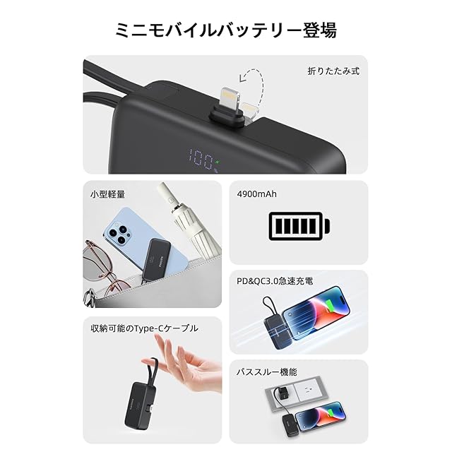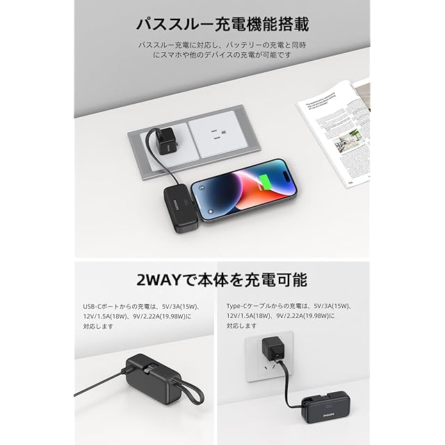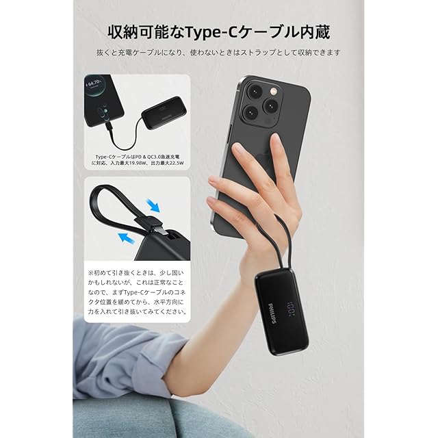 【収納可能な入出力USB-Cケーブル】収納可能な入出力USB-Cケーブルが内蔵し、抜くと急速充電ケーブルになり、使わないときはストラップとして収納できます。PD & QC3.0急速充電に対応しており、入力最大は19.98W、出力最大は22.5Wでございます。パススルー機能も搭載し、スマートフォンとモバイルバッテリーを同時に充電できます。