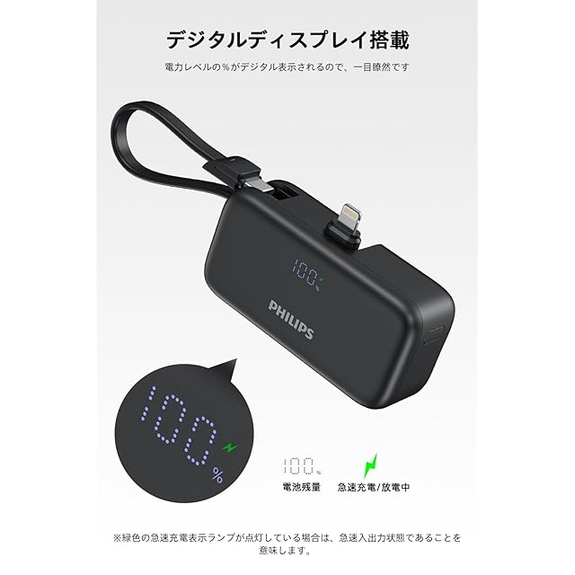 商品名:Philips (フィリップス) モバイルバッテリー 小型 4900mAh 折畳み式 Lightningコネクター type-c ケーブル内蔵 軽量 モバイル充電器 3台同時充電/パススルー機能/LEDディスプレイ PSE認証済 iOS & Android デバイス対応 (ブラック)