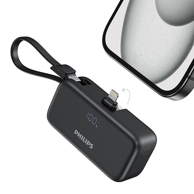 Philips (フィリップス) モバイルバッテリー 小型 4900mAh 折畳み式 Lightningコネクター type-c ケーブル内蔵 軽量 モバイル充電器 3台同時充電/パススルー機能/LEDディスプレイ PSE認証済 iOS & Android デバイス対応 (ブラック)