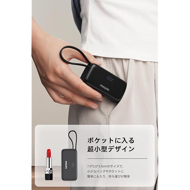 Philips(フィリップス) 超ミニサイズ&2台同時充電可能なモバイルバッテリー LightningコネクターとUSB-Cケーブル 2種類のUSB-C出力口を搭載し、スマホに直接差し込んで充電できます。 コンパクトなため、出張など長い間外出する際の持ち運びにも便利です。 差したまま使えるので、充電しながら通話しやすいものを探している方にもおすすめです。