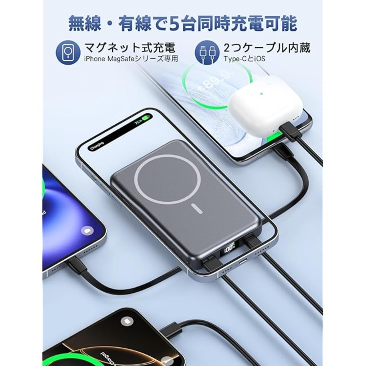 【5台同時充電可能・双方向充電USB-Cポート】マグネット式充電器に搭載されたUSB-Cポートは、入力と出力の両方の機能を兼ね備え、Type-CとiOSケーブルが内蔵され、さらに無線充電も可能で、スマートフォンやタブレット、イヤホンなど5台のデバイスを同時に充電する必要がある場合にも応対可能です。最新技術を採用し、スマホを高速に充電することができます。これは日常的に備蓄電源として使用に最適であり、一日中の安心をいたします。