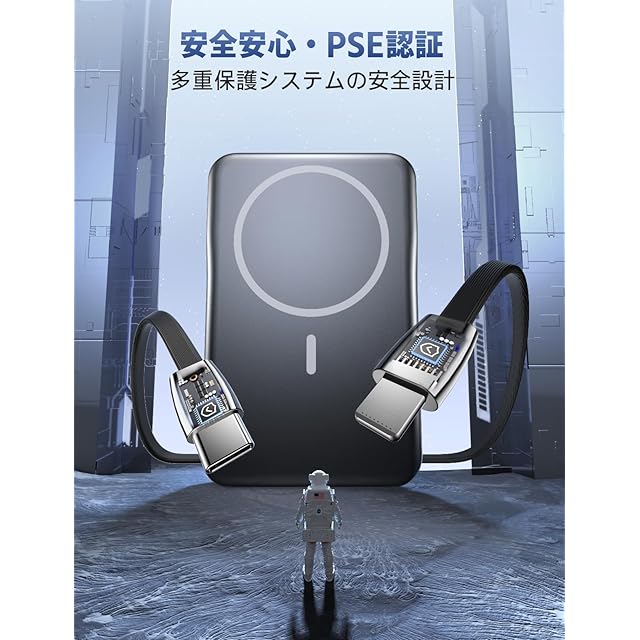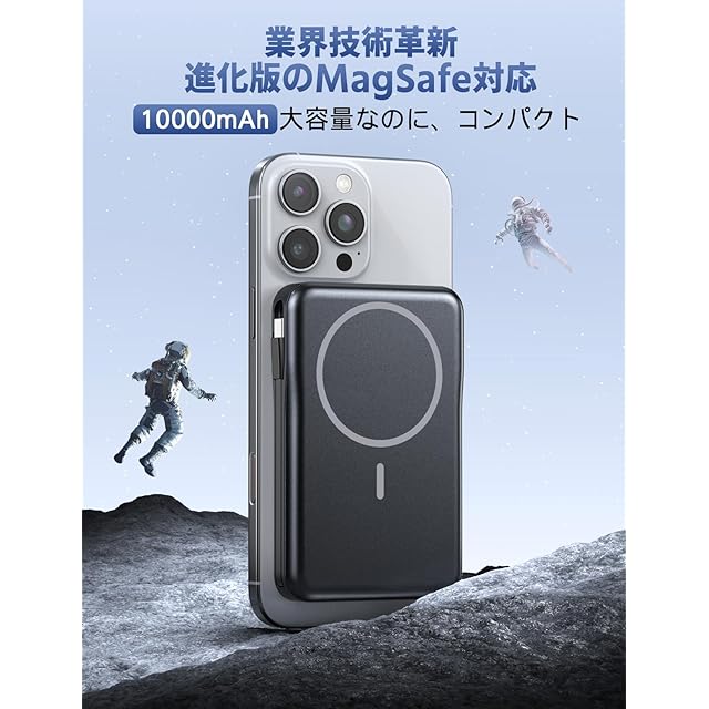 商品名:モバイルバッテリー【MagSafe対応・モバイル バッテリー】10000mAh大容量 20W急速充電 ケーブル内蔵 5台同時充電可能 バッテリー マグセーフ Type-C入出力ポート マグネット式充電器 LED残量表示 軽量 小型 コンパクト PSE認証済み 持ち運び便利 機内持ち込み可能 iPhone16/15/14/13/12シリーズ対応 旅行/出張/停電対策/防災