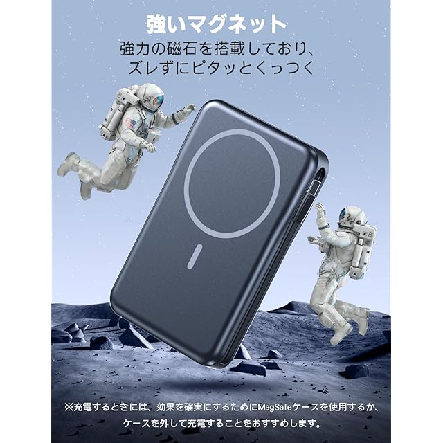 【業界新登場Magsafe・マグネット式ワイヤレス充電】MagSafe技術を採用したモバイルバッテリーは、内部に超強力の磁石を搭載しており、強いマグネットで、ワイヤレス充電器を使用した際の脱落を防ぎます。使用する時にピタッとくっつく、外出時にケーブルを使わずに充電が可能です。 ※本製品magsafe充電機能はmagsafe対応のスマートフォン等のデバイスとマグネット式ワイヤレス充電対応ケースにのみ対応しています。