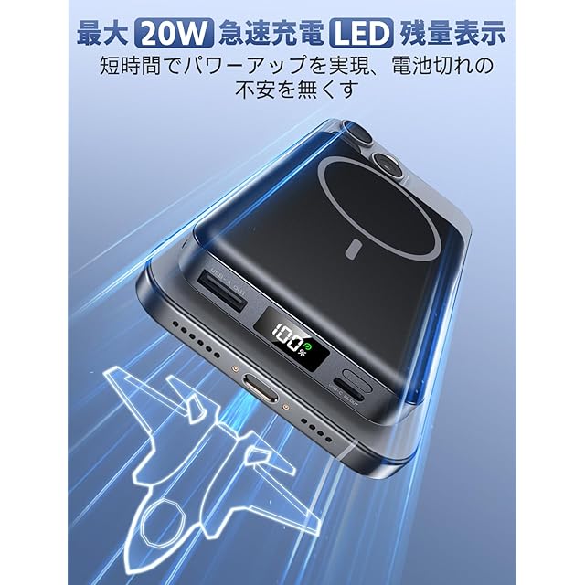 【急速充電対応・最大20W】スマートフォンなどのデバイスを急速で充電できる、業界最新の技術を搭載したこのマグネットモバイルバッテリーは、最大20Wで急速充電も可能で、充電時間を大幅に短縮します。急速充電適応のデバイスには、短時間で大幅なパワーアップを実現可能です。この機能では、長時間の充電によるバッテリーの消耗を最小限に抑えることができ、平日多忙な方にも最適です。