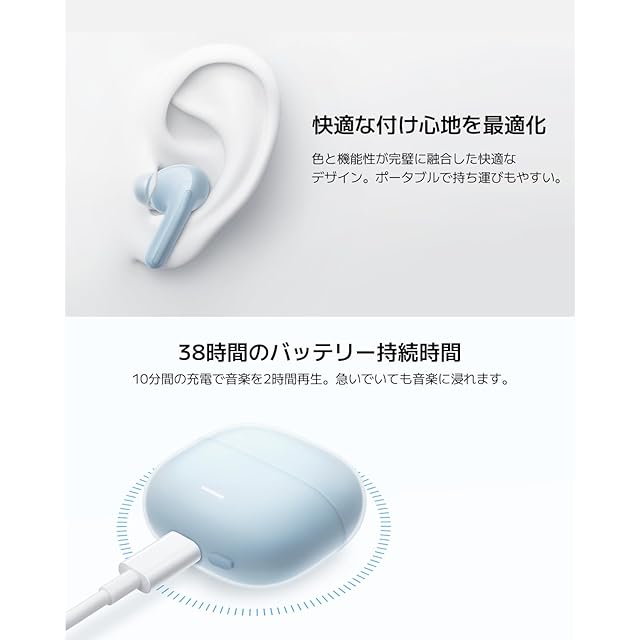 【最大38時間の長いバッテリー持続時間】イヤホンにも、充電ケースにも大容量のバッテリーを内蔵。充電ケースと合わせて使用すれば、最大38時間の長い再生時間を実現。大容量バッテリーのため、頻繁に充電することがなく、万が一うっかり充電を忘れても10分の急速充電で最大2時間の再生が可能です。