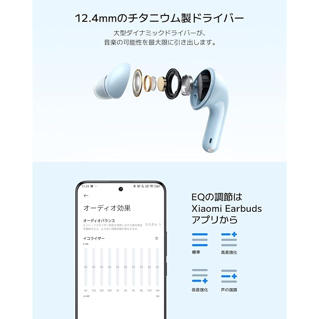 【豊かな音響効果を実現する12.4mmチタニウム製ドライバー】12.4mmのチタニウム製大型ドライバーを搭載し、パワフルな低音、クリアな高音、優れた音質で聴覚体験の可能性と楽しさを引き出します。コーデックはAACまで対応し、音の細部まで味わえます。また、Xiaomi Earbudsアプリ経由して、プリセットされた4種類のイコライザーで音質を調整することができ、自分の好みに合わせてイコライザーをカスタマイズすることでさらに体験を豊かにすることができます。