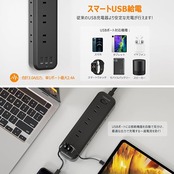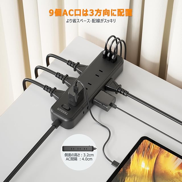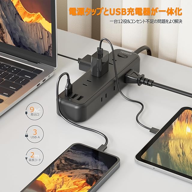 【1台12役のusb 電源タップ】このusb コンセント タップは3個のusb-aポートと9個のac差込口を搭載しています。異なった三つの方向に3個ac口が配置されていて、お互いに干渉しないで、大きなアダプター同士が同時に挿入しても大丈夫です。これ1つのusb タップで、12台の機器を同時に充電できます。コンセント不足の問題が解決できます。