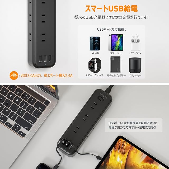 【usbスマート充電可】このタコ足コンセントは三つのtype-aポートがあります。単一usbポートは5V 2.4Aで、3個usbポートは合計5V 3.0Aになります。理想的な出力でインテリジェントに充電します。 カメラ、スマートフォン、タブレット、パワーバンクなどに最適です。デバイスに最適な電流を流す「スマート IC」により、安全に充電できます。