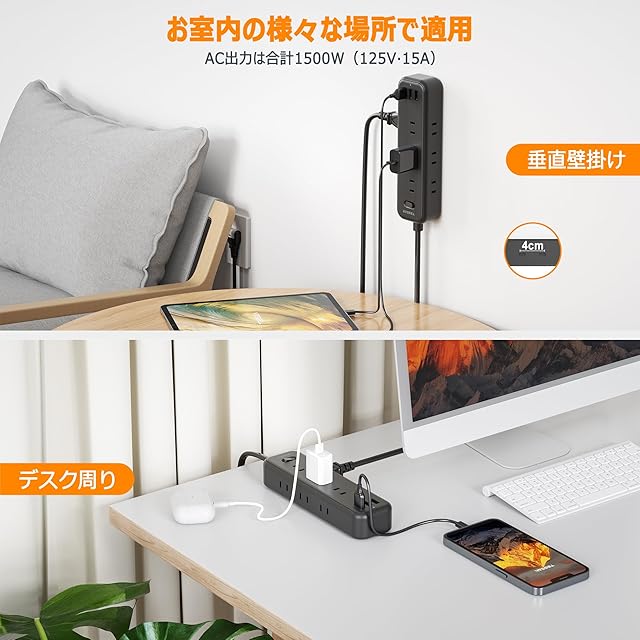 【壁掛け用穴/滑り止めフッドパッド付】このたこあしコンセントの背面に壁掛け用穴が付いて、壁にかけて空間を節約できます。また、四つの滑り止めフッドパッドが付いて、デスクの上にしっかり置くことができます。1500Wの合計最大出力で、宅内のリビング、キッチン、ベッドサイドやトイレなどの様々な場所にご利用頂けます。ご注意:日本国内のみご使用できて、海外での使用は禁止です。