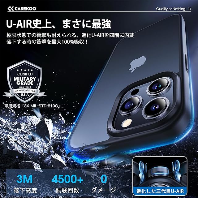 【米軍MIL認証済み・もしもの時も安心】米軍MIL規格「MIL-STD-810G」をクリアした強靭なiPhone 15 Pro 用ケース。四隅のAir-Shock5.0と三層の耐衝撃構造により、3.85mの高さから5500回、36方向でアスファルトや砂利に落下させてもスマホ本体は無傷!日常使いから旅行まで、どんなシーンでも安心して使える。【365日安心】12時間以内に対応、安心してご購入ください!(購入履歴→購入商品→販売者→質問からご連絡ください)米軍MIL認証番号:GZMR220702237705