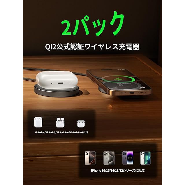 【幅広い互換性】このワイヤレス急速充電器は、iPhone16/15/14/13/12シリーズを含む多数のデバイスをサポートしており、ワイヤレス充電に対応したiOSおよびAndroidデバイス(マグネットリングやMagSafeケースと一緒に使用することができます)。チャージャーと充電デバイスの間に、厚さが3mmを超える携帯ケースや金属アイテム(鍵、クレジットカード、金属製携帯ケースや金属リング)を置かないでください。磁性吸着と充電性能に影響を及ぼす可能性があります。
