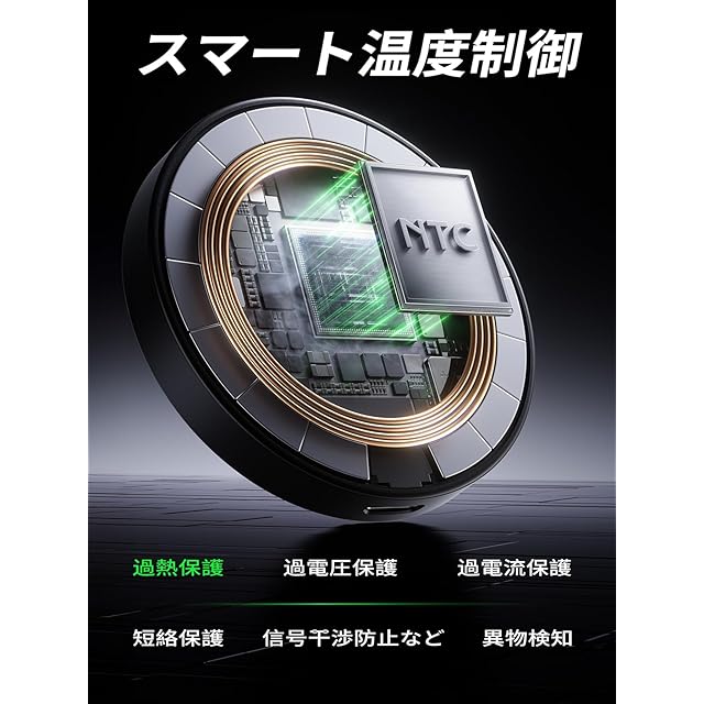 【スマート温度制御で安全に安心】このマグセーフ無線充電器は、超伝導熱石墨烯素材とマルチレイヤー放熱構造を内蔵しています、効果的に放熱をサポートします。過熱保護、短絡保護、過電圧保護、過電流保護、信号干渉防止などの多重保護機能も備えています。全く新しい「異物検知」機能により、充電エリア内に金属異物を検知した場合、自動的に充電を停止し、過熱を防ぎます。電池残量が80%に達すると、自動的に充電モードが切り替わり、微小な電流でデバイスの電池の過剰消耗を防ぎます。バッテリーを保護し、安全に充電しながら、毎晩安心して眠れるようにします。
