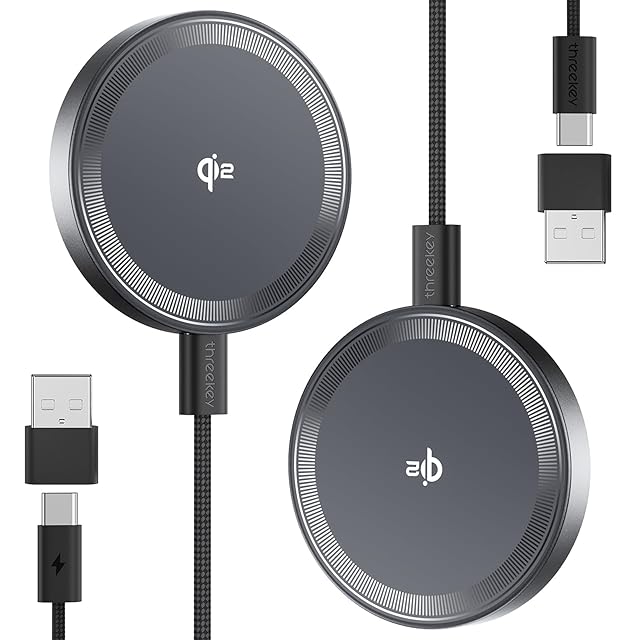 商品名:THREEKEY ワイヤレス充電器【Qi2 PSE 公式認証】15W超低温 MagSafe充電器 両面マグネット式 マグセーフ充電器 1:1適合 强磁気 iPhone 16/15/14/13/12シリーズ/Galaxy S25 Ultra対応 60W+1.5m高耐久編み込み式ケーブル デュアルUSB-A/C入力ポート 出張·旅行·オフィスに最適 (ブラック, 2 パック)