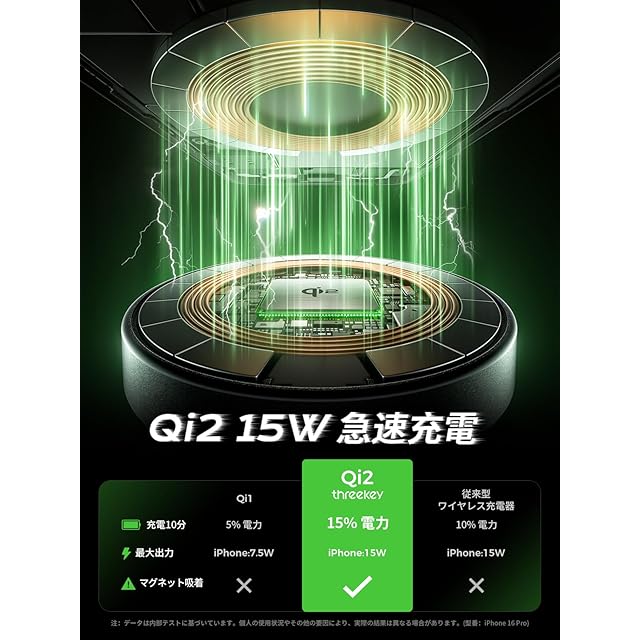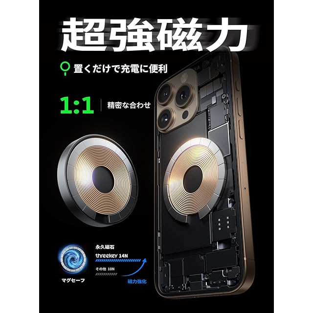 【Qi2公式認証 · 15W急速充電】THREEKEY ワイヤレス充電器、Qi2公式認証とMagSafe機能に対応、で正確な位置にピタッと吸着し、安全なワイヤレス充電を行えます。市販多数の7.5Wワイヤレス充電器と比較して、本製品はiPhone最大15W出力でワイヤレス充電が可能です。2.5時間でiPhoneをフル充電でき、あなたの充電体験をアップグレードしましょう。注意:20W以上の電源アダプタを使用して最大限の充電効率を得ることができます(アダプタは付属していません)。