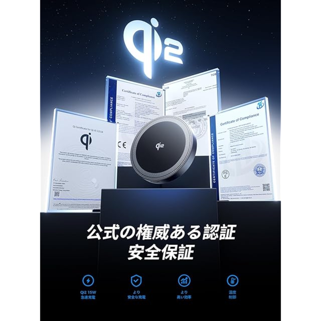 【精美なデザインで · 小型軽量で持ち運べる · 使いやすいです】Qi2ワイヤレスチャージャーは、高強度の強化ガラスとV0級の阻燃防火材料でできており、細かいマットな質感とファッションで高級感のある外観をしています。厚さはわずか10mmで、非常に軽量で、簡単にズボンのポケットやバッグに入れて持ち運ぶことができ、旅行や出張に適しています。