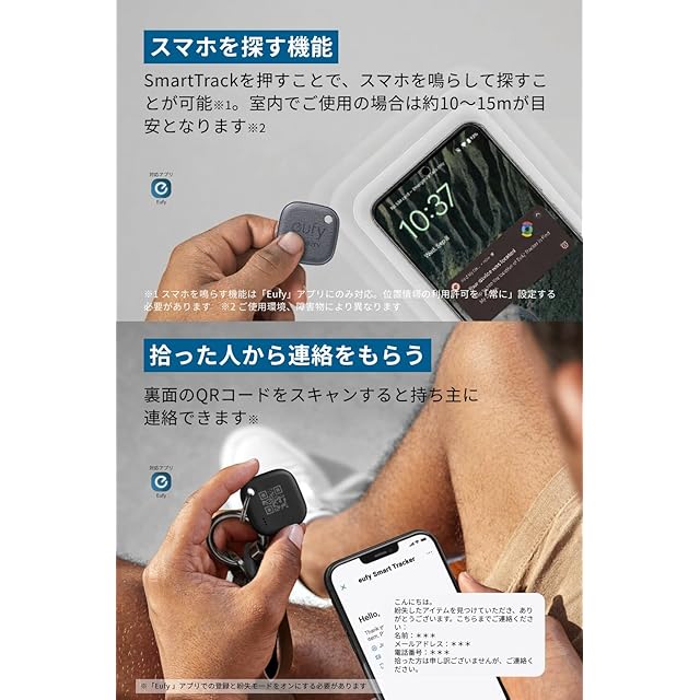 拾った人から連絡をもらう: 裏面のQRコードをスキャンすると持ち主に連絡できます。※「Eufy 」アプリでの登録と紛失モードをオンにする必要があります