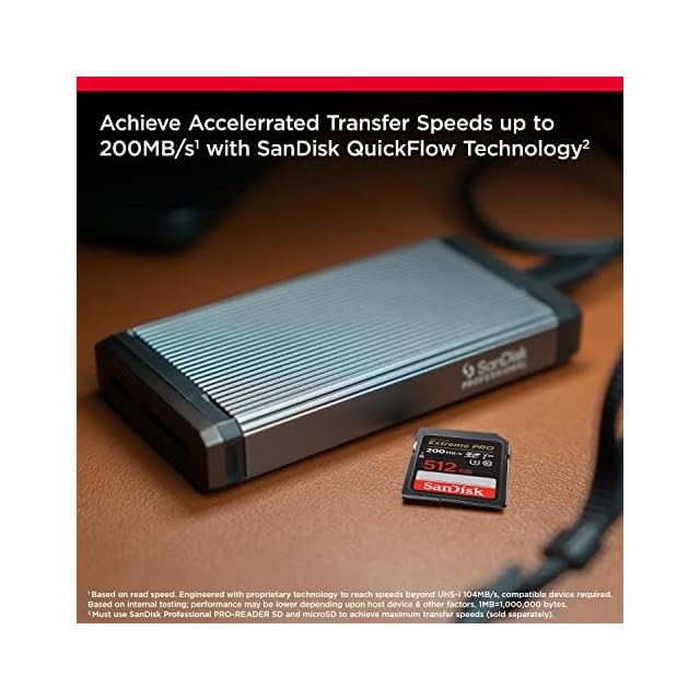 SanDisk QuickFlowテクノロジーを搭載した最大200MB/秒のカードオフロード速度で時間を節約。(最大200MB/秒の読み取り速度。UHS-I 104MB/秒を超える速度に達する独自の技術で設計されています。そのような速度に達することができる互換性のあるデバイスが必要です。 内部試験に基づいています。ホストデバイス、インターフェース、使用状況などの要因によってパフォーマンスが低下する場合があります。 1MB (メガバイト) =100万バイト。 X = 150KB/秒。 SanDisk QuickFlowテクノロジーは、64GB、128GB、256GB、512GB、1TBの容量のみで利用できます。 1GB (ギガバイト) = 10億バイト。 1TB (テラバイト) = 1兆バイト。 実際にユーザーが使用できるストレージ容量はこれより少なくなります。)