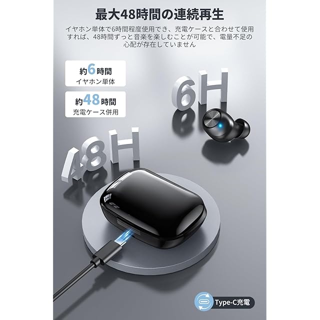 【最大48時間連続使用・LED残量表示・Type-C急速充電】先端Bluetoothチップかつ省電力設計により、T08は一回のフル充電だけで約6時間連続音楽再生が実現でき、左右のイヤホンを交互に使えば最大12時間までに連続再生でき、充電ケースとあわせて合計最大48時間の使用可能です。また、転送速度・互換性に優れたType-C急速充電対応で、充電時間を短縮し快適に使用できます。さらに、LEDディスプレイ電池残量表示付きで、充電ケースの電池残量が一目瞭然です。充電切れの心配が全く不要です。【片耳/両耳使用対応】どちらのイヤホンを取り出しても単独で使用できます。両耳のイヤホンを装着すると立体音響をより力強く耳に届けます。好みや使用シーンに合わせて使い分けることができます。