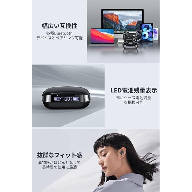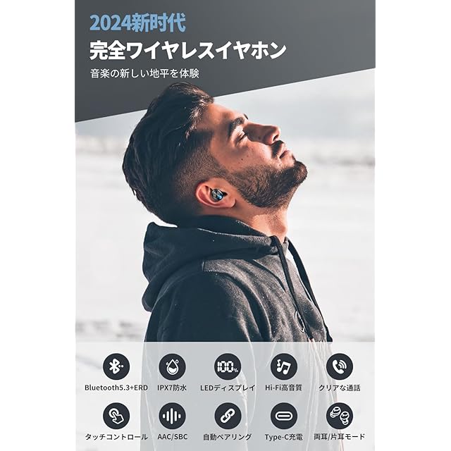 【タッチボタン】本bluetoothイヤホンはタッチコントロール対応で、ポケットからデバイスを取り出しなくても音量調整/音楽再生/一時停止、通話/終了/拒否/次の曲/前の曲/Siri起動などの簡単な操作ができます。【IPX7防水】IPX7防水性能により、どちらの方向からの水の飛沫も入られません。汗や塵を防ぎ、ランニング、フィットネス、アウトドアスポーツなど運動中に汗をかいても大丈夫です。※ご注意:充電ケースは防水仕様ではありません。【パッケージ内容】パッケージ内容:充電式収納ケース、Bluetoothイヤホン*2、Type-C充電ケーブル、イヤーピース×3ペア(Mが初期装着)、日本語取扱説明書。