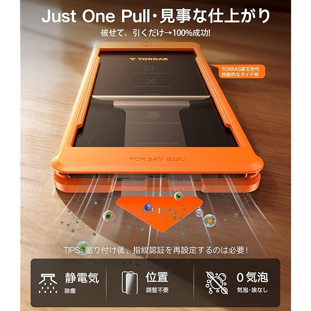 【Just One Pull・貼り付け超簡単】TORRASの第五世代ガイド枠により、Just One Pull→ハンドルを引く、完璧な仕上がり。引き出し時の静電気で二次除塵も実現すれば、自動排気機能も搭載。「自分で貼ると歪み、気泡、ホコリ、浮きなどの問題が起こりやすい」というストレスから解放~素人でも100%完璧に貼り付け。そして、Galaxy S25 Ultra用強化ガラスは極限まで磨いたラウンド加工技術を採用し、滑らかで手に優しく美しい狭いベゼルを忠実に再現。まるでオリジナルデザインの一部であるかのように、完璧な一体感を。※Just One Pull枠は2020年に市場初登場し、現在は第5世代の製品である。業界一番上の便利さと簡単操作、成功率の高い画期的な貼り付けソリューション。(*気泡除きヘラは白い箱の後ろにある。ページに気泡の取り除きビデオが付き。)