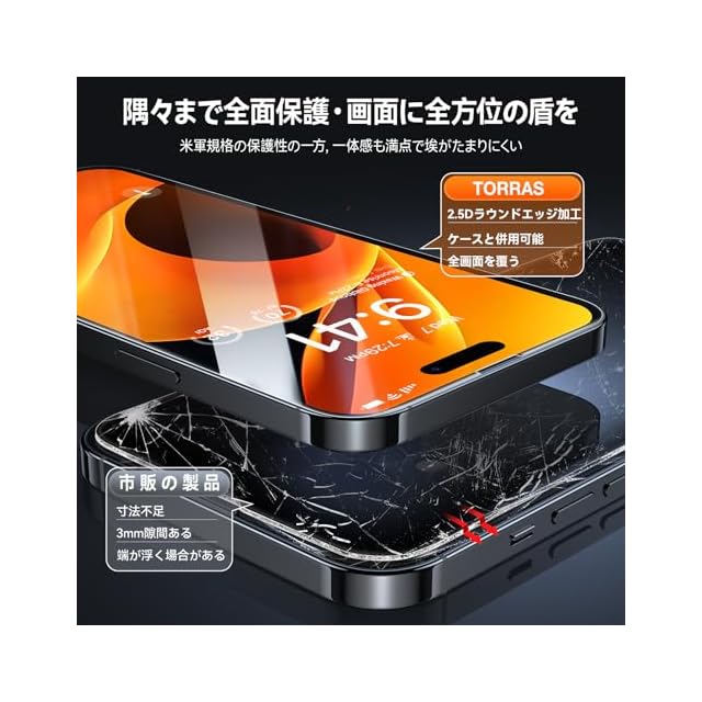【品質付き】最大12ヶ月 ※TORRAS公式販売店からの注文に限り6ヶ月の対象となり、注文番号で12ヶ月までの延長を申し込むことができます。 【連絡方法】「商品ページ」→「販売元:TORRASDirect」→「質問する」 【宇宙航空材料・究極の保護力】iPhone15Pro用ガラスフィルム(2023年6.1インチ)日本製AGCの航空宇宙用途に特化したガラス材料(Dragontrail)を採用し、表面硬度が9Hを超え、鉱石の硬さを示すビッカーズ硬度Hv673を実現します。極限の衝撃、圧力、摩擦の環境下でも、高い保護力と卓越した耐久性を発揮します。十年にわたって蓄積してきた保護分野での革新を受け継ぎ、20カ国で累計9000万枚販売し、画面の破損記録がゼロとなっています。