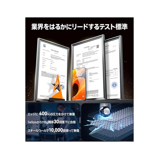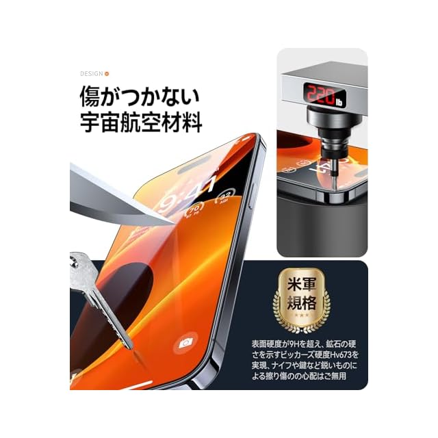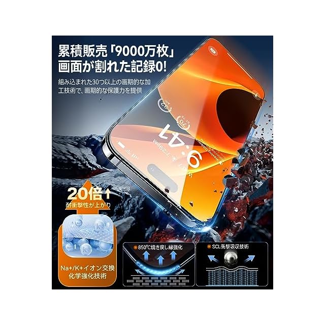 【米軍規格超え・衝撃から守れ】組み込まれたNa+/K+イオン交換、SCL緩衝層などの30つ以上の革命的な加工技術で、表面に圧縮応力層を発生させ、耐衝撃性が普通製品より20倍も高いです。更に、伝わる衝撃力を瞬時に分散させ、アイフォン15Proの液晶画面に正面からの衝撃による割れを徹底的に防ぐ、本当にスクリーン保護と絶対的な安心感を与えます。※米軍「MIL-STD-810G」規格認証番号:GZMR220300626209|認証機関:CSTC Standards Testing Center|Mar 28, 2022