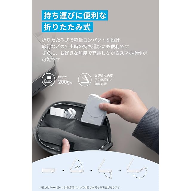 持ち運びに便利な折りたたみ式:折りたたみ式で軽量コンパクトな設計 旅行などの外出時の持ち運びにも便利です。さらに、お好きな角度で充電しながらスマホ操作が可能です。