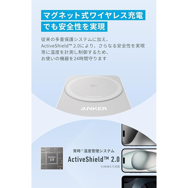 マグネット式ワイヤレス充電でも安全性を実現:従来の多重保護システムに加え、 Active Shield 2.0により、さらなる安全性を実現 常に温度を計測し制御するため、お使いの機器を24時間守ります。