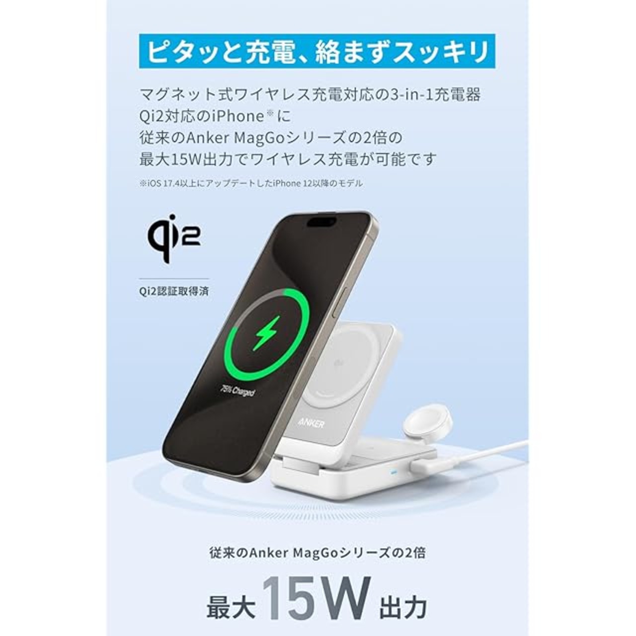 商品名:Anker MagGo Wireless Charging Station (Foldable 3-in-1) Qi2対応 マグネット式 3-in-1 ワイヤレス充電ステーション/ワイヤレス出力/Apple Watchホルダー付 MagSafe対応 iPhone 16 / 16 Pro / 16 Pro Max / 15 / 14 / 13 ホワイト