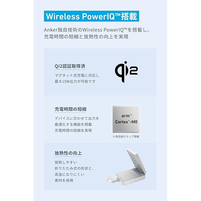 Wireless PowerIQ搭載:Anker独自のWireless PowerIQを搭載し、 充電時間の短縮と放熱性の向上を実現しました。