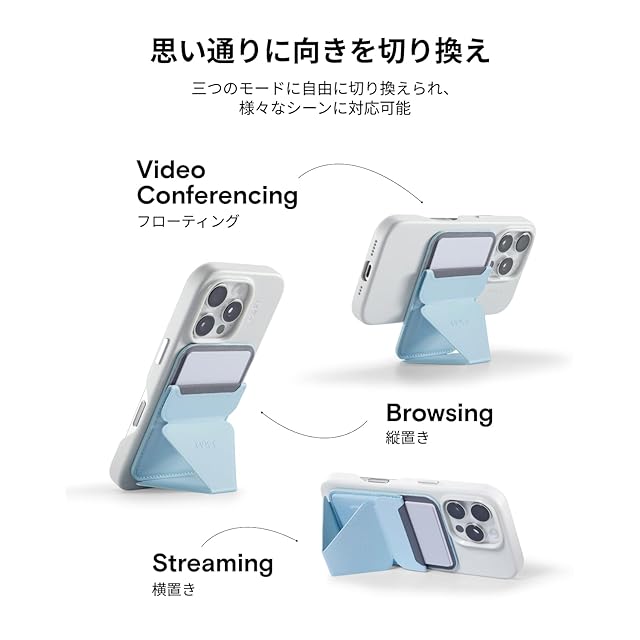 【三つの使用モード・自由に切り換え】マグネット内蔵で、MagSafe対応機種(iPhone16/15 /14/13/12シリーズ)にお使いいただけます。縦置き、横置き、フローティングモードに自由に切り換えられ、様々なシーンに対応可能です。