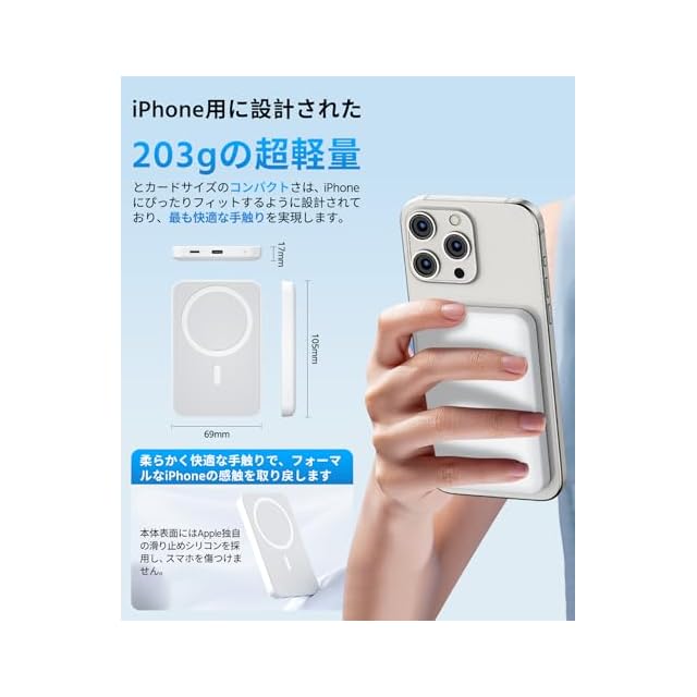 【10000mAh大容量なマグネット式モバイルバッテリー】いつもモバイルバッテリーにケーブルで持ち歩いて不便で考える方が多いのことで、今回弊社はマグセーフ技術を応用し、大容量の10000mAhマグネットモバイルバッテリーを開発されました。市販の5000mAhか8000mAhのモデルと比べ、同じく小型で持ち歩いて便利を含め、更にバッテリーの容量を増加し、同じ金額でより良いモバイルバッテリーを選択できます。200gの超軽量の上に、持ちが悪くなり困っている方や、移動中に動画やアプリのゲームをよく利用する方に最適です!日頃の使用はもちろん、キャンプ、登山、ハイキングなどアウトドアや、停電、地震、台風など緊急時の非常用電源として役に立ったモバイルバッテリーです。