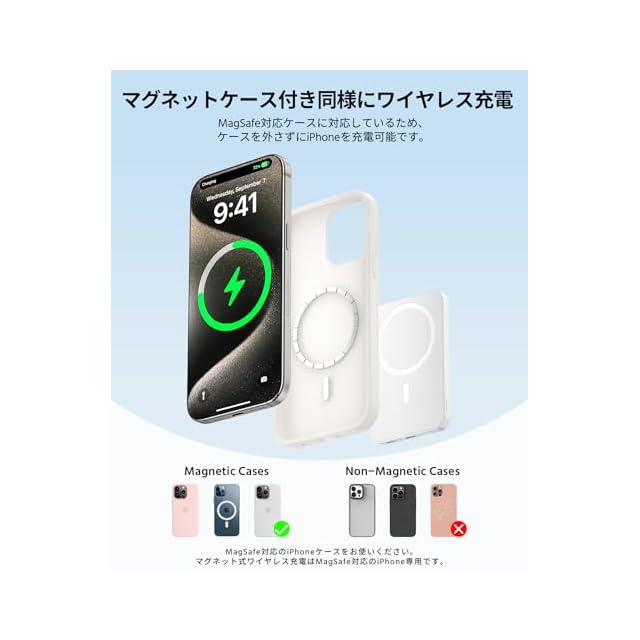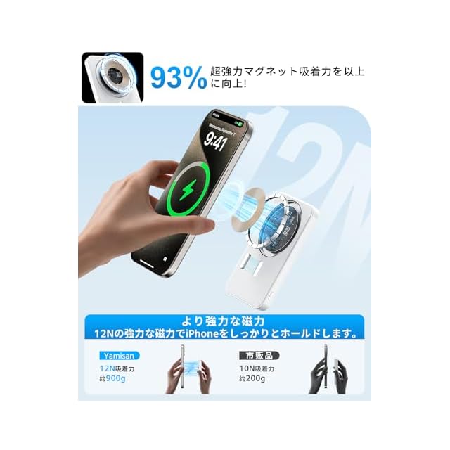 【ワイヤレス充電・優れなマグネット吸着力】磁力で自動固定:マグセーフ技術に応用、強い磁力のマグネット1輪が内蔵、iPhone16/15/14/13/12全シリーズに対応を近づけるだけで、後ろにピタッと吸着します。面倒な充電ケーブルの抜き差しが必要無く、パススルー充電に対応しているので、ワークスペースでの充電パッド代わりや就寝中の給電にぴったりです。ケースご使用になる場合はマグセーフ対応ケースである必要があります。iPhone 14/13/12 シリーズを除き、磁気充電をサポートするその他のモバイル デバイスは、マグセーフ 対応 ケースまたは磁気リングを使用してワイヤレスで充電する必要があります。「ご注意:一部SEシリーズはマグセーフ機能対応しませんので、ご了承ください。