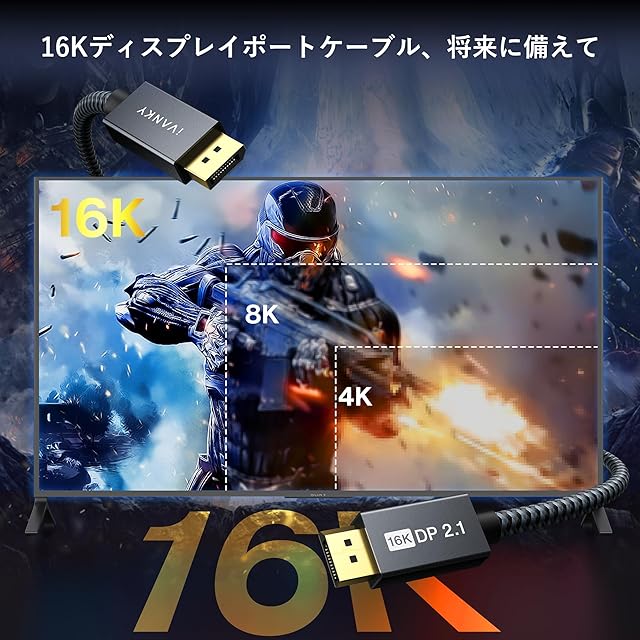 商品名:iVANKY 16K Displayport ケーブル 2.1規格【DPケーブル 2M】16K@60Hz/8K@60Hz 4K@240Hz/165Hz/144Hz,ディスプレイポート ケーブル 最大40Gbpsハイスピード、HDR/DSC / 1.2a / FreeSync&G-Syncなどに対応 DP 2.1