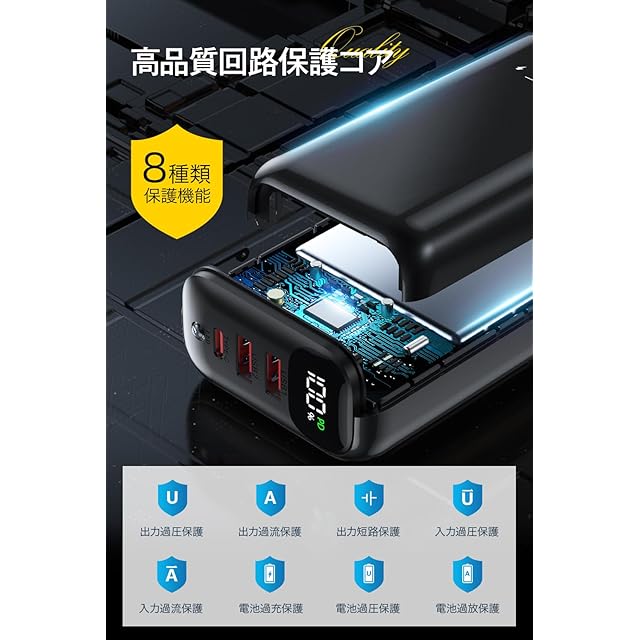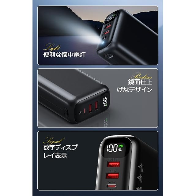 商品名:モバイルバッテリー 大容量 【2025新設計・60000mAh大容量・PD20W急速充電】 バッテリー 携帯充電器 3台同時充電可能 Type-C入出力ポート 最大27W出力 USB-A出力ポート 22.5W スマホ充電器 LCD残量表示 コンパクト LEDライト iPhone/Android各種スマホ対応 PSE技術認証済 安全回路保護 アウトドア/停電/防災緊急用