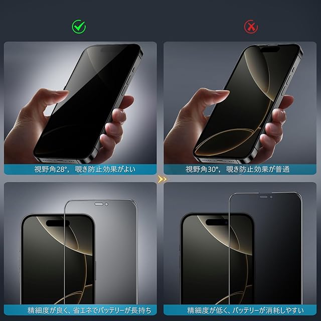 【360度覗き見防止,プライバシーフィルム】 iPhone16Promaxの360度覗き見防止フィルム,上下左右4方向の360度(前から约28度の視視角)のぞき見防止。正面から見る時はっきり見える、高透過率があり,側方から見るときにはブラインドを通して画面が徐々に暗くなる。画面の表示内容や個人情報は完璧に保たれ、周りからののぞきを心配せずにLINEやメールを交換できます。