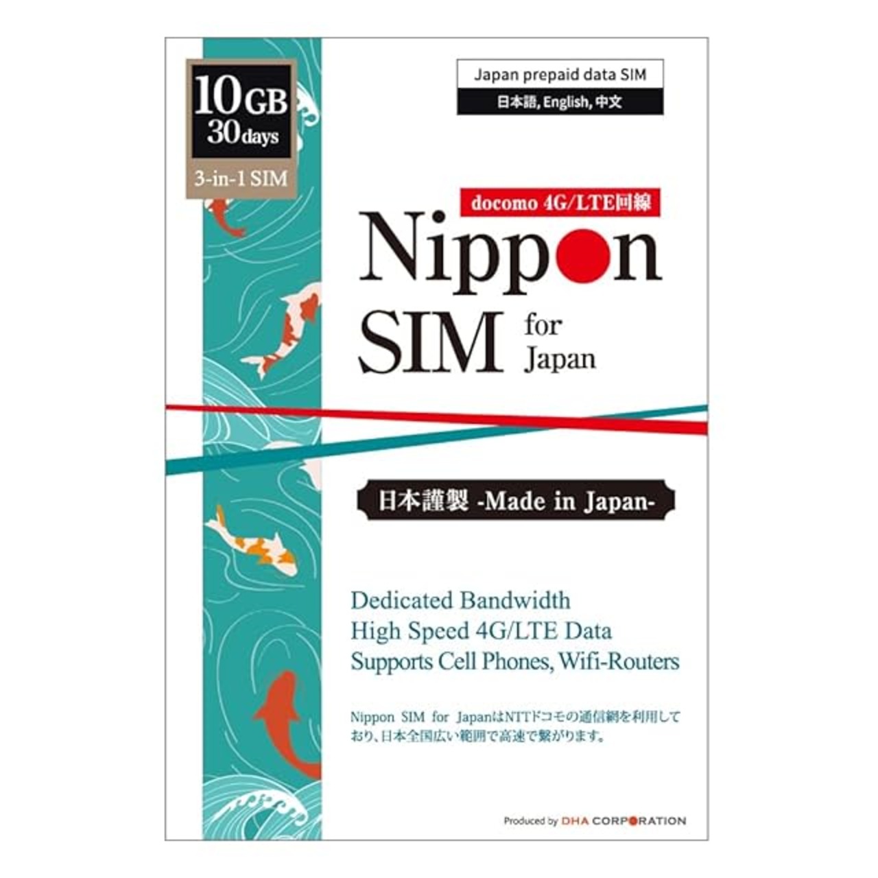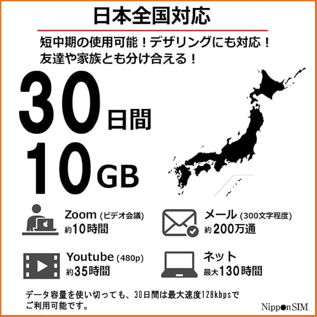 【NTTドコモの通信網で高速通信!】 30日間 10GB、NTTドコモの通信網で広範囲の高速通信!ご購入のデータ容量を使い切っても、30日間は最大速度128kbpsでご利用可能です。【対応SIMサイズ】 標準、Micro、nano サイズ切り替え可能 【製品パッケージ】SIM カード/SIMピン/多言語マニュアル(日本語・英語・中国語)。