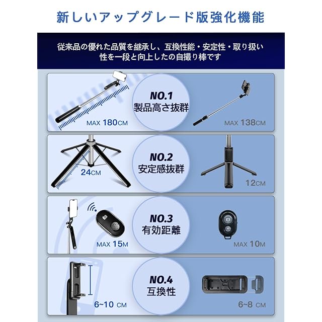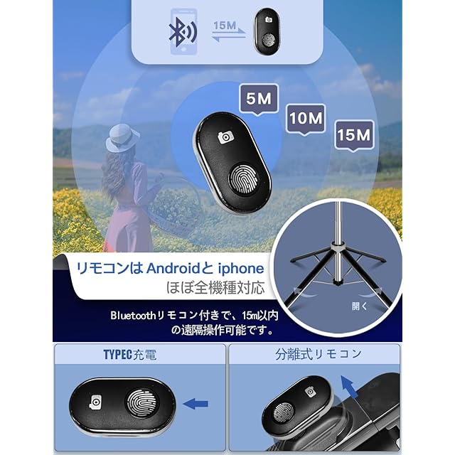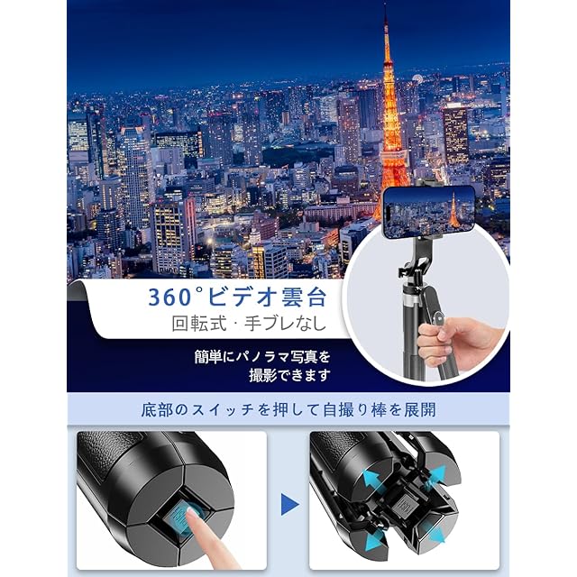 スマホ 三脚 自撮り棒 長い 180cm以上 スマホスタンド 【設計強化180cm & 充電式リモコン】1/4ネジ付き じどり棒 カメラ 一脚/ 三脚 360°回転 コンパクト iPhone&Androidに対応 【日本語取扱説明書付き】 | TREND DESIGN 家電専門店