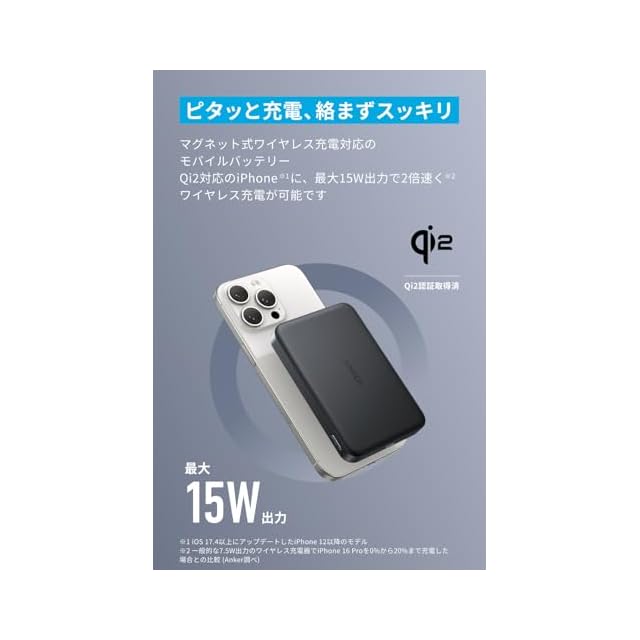 ピタッと充電、絡まずスッキリ:マグネット式ワイヤレス充電対応のモバイルバッテリー。Qi2対応のiPhoneに、最大15W出力で2倍速くワイヤレス充電が可能です。