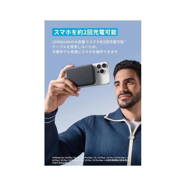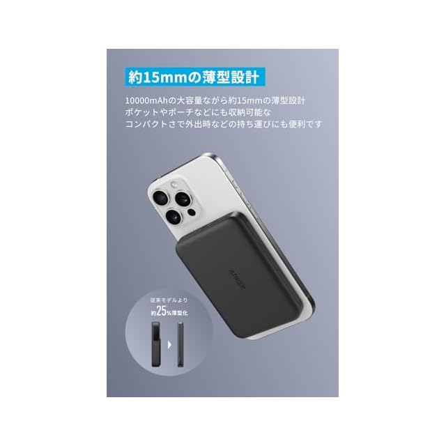 商品名:Anker MagGo Power Bank (10000mAh, Slim) Qi2認証 ワイヤレス充電 最大出力15W MagSafe対応 マグネット式ワイヤレス充電対応 コンパクト 薄型 小型 iPhone 16 / 15 / 14 / 13 / 12 シリーズ専用 (ブラック)
