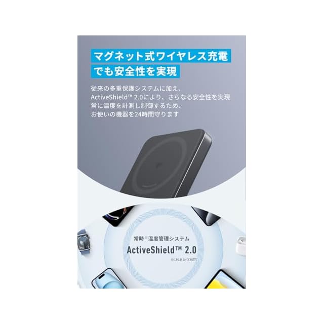 マグネット式ワイヤレス充電でも安全性を実現:従来の多重保護システムに加え、ActiveShield 2.0により、さらなる安全性を実現。常に温度を計測し制御するため、お使いの機器を24時間守ります。