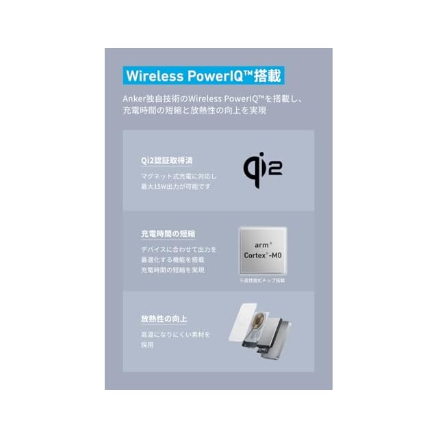 Wireless PowerlQ搭載:Anker独自技術のWireless PowerlQを搭載し、充電時間の短縮と放熱性の向上を実現。
